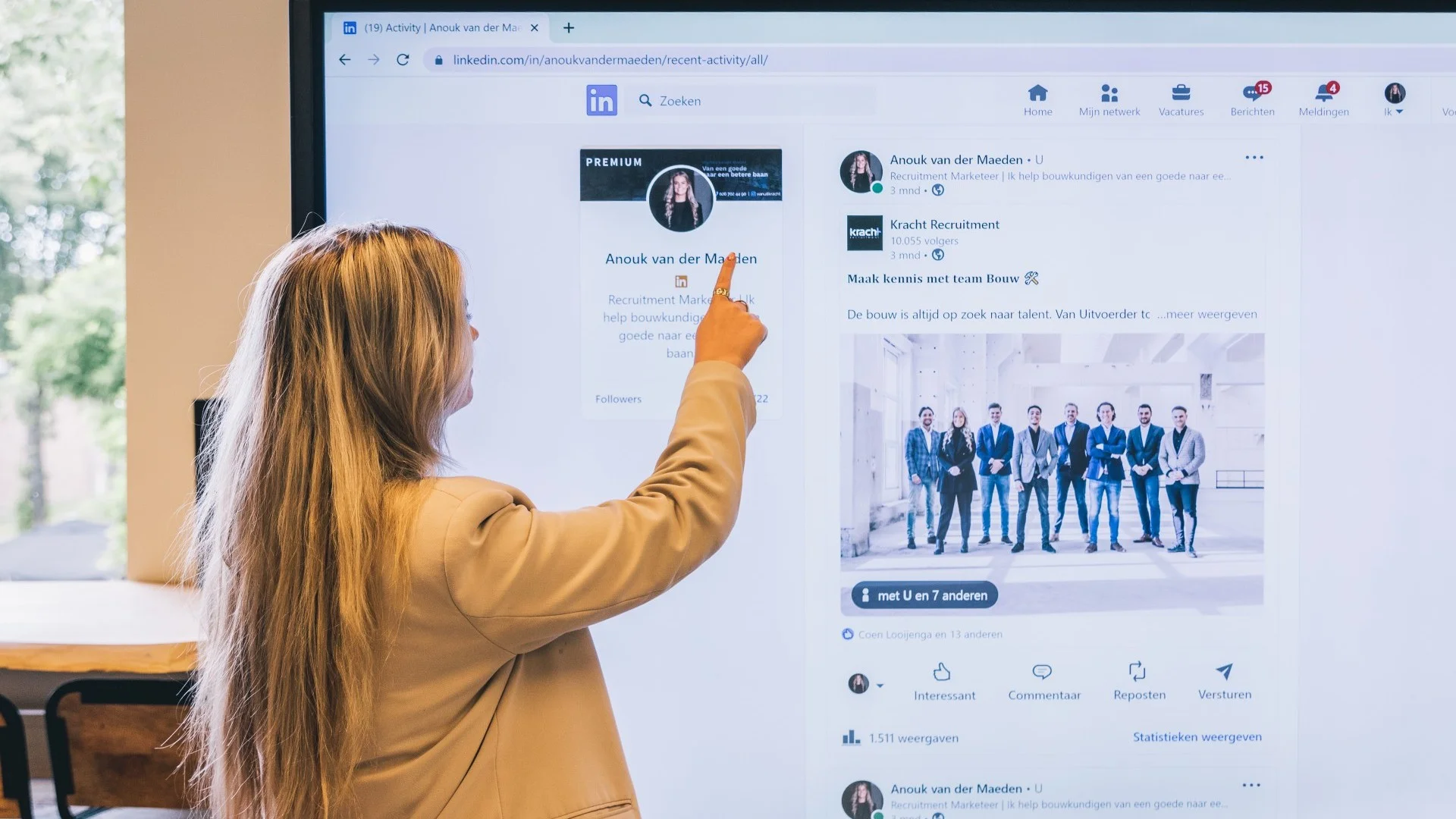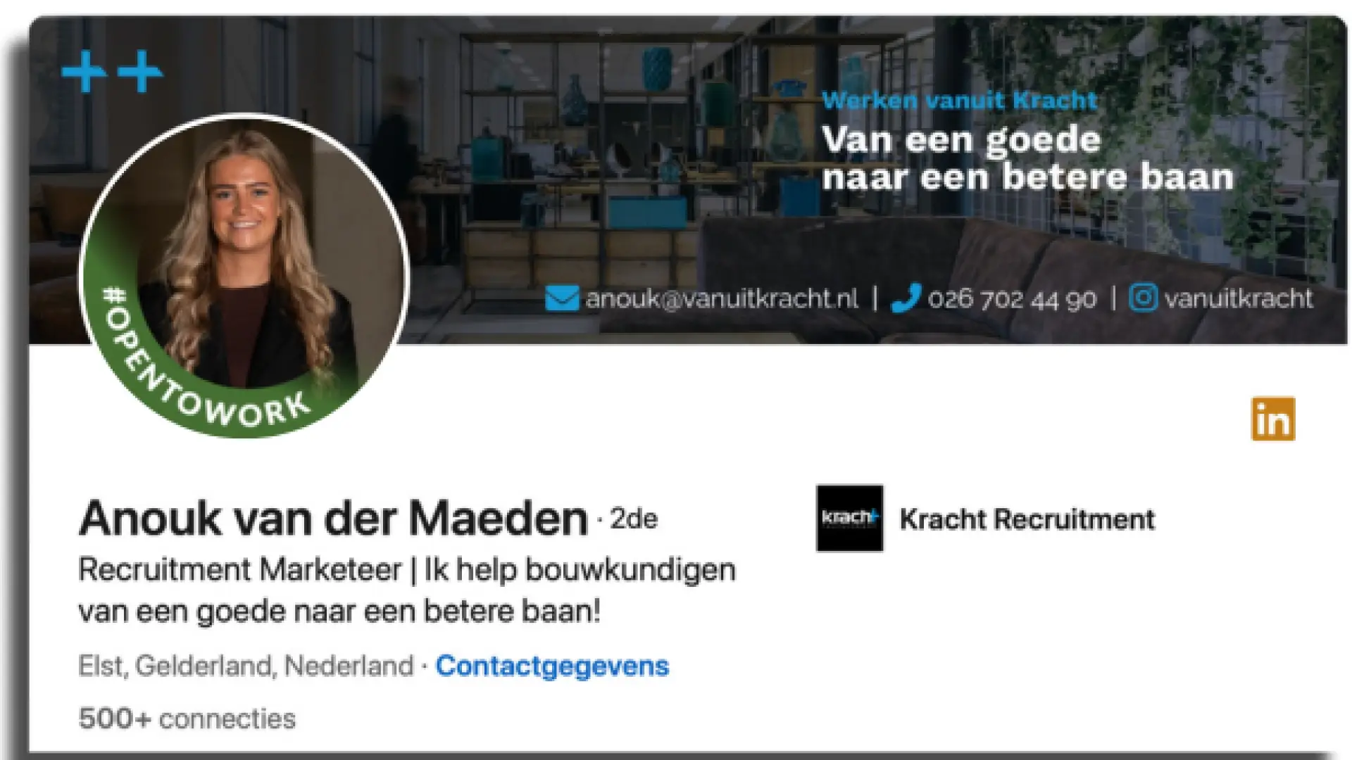 LinkedIn legt steeds meer nadruk op visuele aspecten. En zeg nou zelf, een visueel mooi profiel is stukken leuker om te lezen. Zorg er daarom voor dat jouw profiel er aantrekkelijk uitziet door verschillende visuele elementen toe te voegen. Plaats een achtergrondbanner bovenaan je profiel met afmetingen van 1584 x 396 pixels. Hier kun je veel leuke dingen mee doen. Bij Kracht verwerken we daar een stukje branding en onze persoonlijke contactgegevens in. Bij de sectie ‘Ervaring' kun je ook media en links toevoegen. Sinds enige tijd heeft LinkedIn ook de ‘Uitgelicht' functie. Daarin kun je aantrekkelijke content, artikelen, posts, foto's en links laten zien. Hiermee houd je de aandacht van je profielbezoekers langer vast.